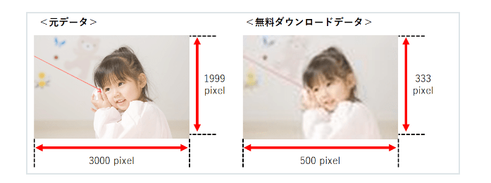 低解像度版の印刷画質について教えて2025年11月21日 更新保護者アプリで無料ダウンロードした場合、長辺が500pixelに圧縮され、元データの縦横比に合わせて短辺も圧縮されるため、画像の解像度が低下します。そのため、印刷には適していませんのでご注意ください。