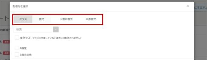 - [配信先を選択] > [クラス] または [園児(児童)] のタブを選択し、配信先にチェックを付けます。