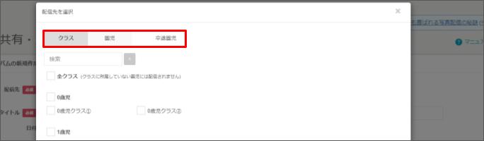 - [配信先を選択] > [クラス] または [園児(児童)] のタブを選択し、配信先にチェックを付けます。