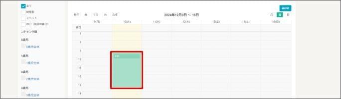 開始したい日の開始時間の部分をクリックし、そのまま終了時間まで下にドラッグしてください- 終日の場合は、カレンダー上部の [終日] をクリックします。