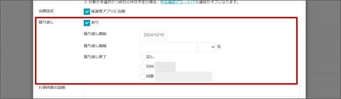 - 行事を繰り返す場合は、「繰り返し」 > [あり] にチェックを付けます。<任意>