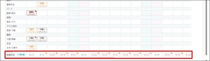 配置充足を確認する2026年2月18日 更新このページの操作を行うには、以下の設定が事前に必須です 【設定】保育士の配置数を設定する [シフト管理] をクリックします。 確認したい月を選択します。 画面下部に表示されている「配置充足」を確認します。画面上部の [絞り込み] から表示条件を絞り込めます。 背景が白色 配置数に問題がない状態です。 背景が赤色 最大必要配置数が不足している状態です。 数字右上のオレンジ三角 配置数が不足している時間帯がある状態です。 不足の時間帯は日次画面で15分単位で確認できます。