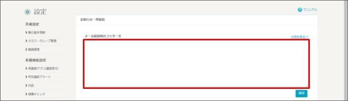 【設定】お知らせ一斉配信時のメールの署名を登録する2026年1月13日 更新設定画面の操作は、設定機能の権限が「承認可能」であることが必須です。 [設定] をクリックします。 左側[お知らせ一斉配信] をクリックします。 「メール配信時のフッター文」に文章を入力します。 [保存] をクリックします。