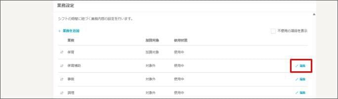 - 「業務設定」から設定したい業務の [編集] をクリックします。