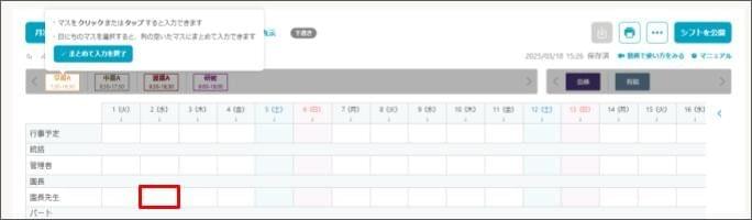 - シフトを作成したい日付の職員の枠をクリックします。