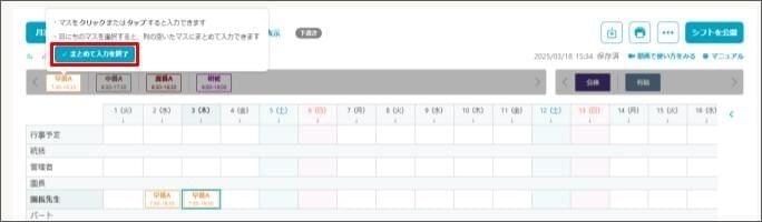 - 作成したいシフトパターンをクリックし、[まとめて入力] をクリックします。