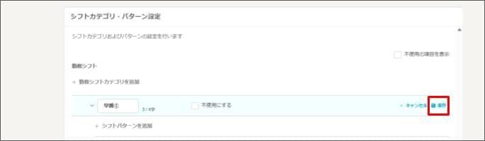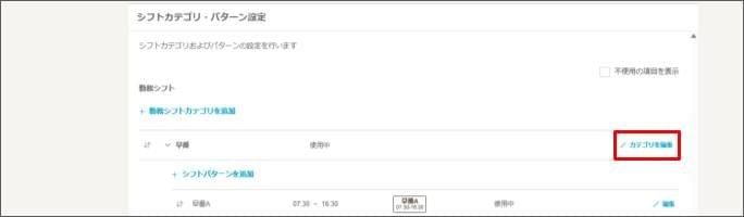 - 「シフトカテゴリ・パターン設定」 > 「勤務シフト」から編集したいカテゴリの [カテゴリを編集] をクリックします。