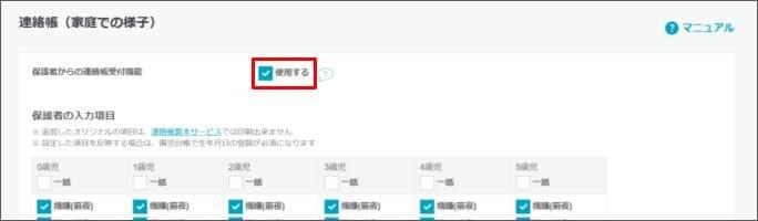 - 「連絡帳(家庭での様子)」の「保護者からの連絡帳受付機能」 > [使用する] にチェックを付けます。
