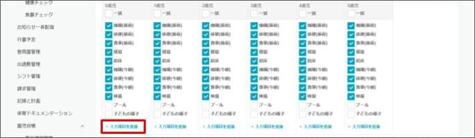 - 「保護者からの連絡帳入力項目」で年齢ごとに入力連絡してほしい項目にチェックを付けます。