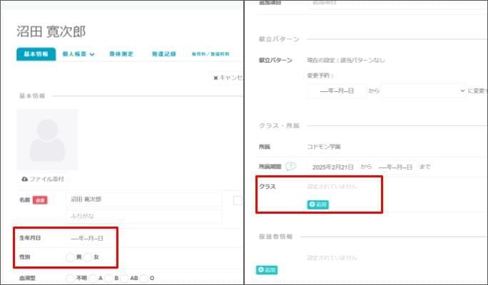 - 「クラス」は、絞り込み表示やクラス別管理などに対応できるため、あらかじめ設定してください。
