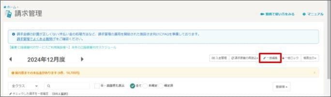 - 請求状態が「未確定、確定済み」の園児(児童)のみが一括編集の対象です。請求を作成すると一括編集の画面に表示されます。