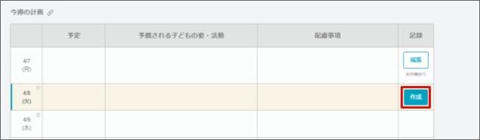 ※記録と計画の画面で週案を承認済みの場合作成できません。承認の取り消しを行ってください。 - 「活動の記録」 > [活動の記録を記入] をクリックします。