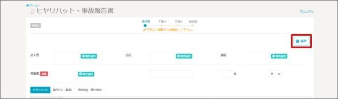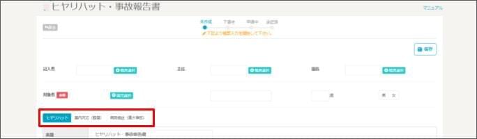 - 報告内容に応じて「ヒヤリハット、施設内対応(軽傷)、病院搬送(重大事故)」のいずれかのタブをクリックします。