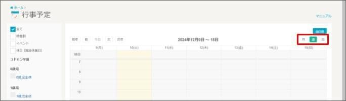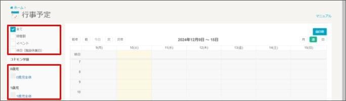 行事予定を確認する2025年12月10日 更新 [行事予定] をクリックします。 右上の [月、週、日] から確認したい期間を選択します。 左側から行事種別や対象クラスの絞り込みをします。 行事の種別 [時間割、イベント、休日(施設休業日)] から選択します。 対象クラス [クラス名、グループ名] にチェックを付けます。