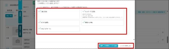 - 「レシピ追加の確認」でレシピを登録したい場合は、[選択した料理をレシピに追加] をクリックします。<任意>