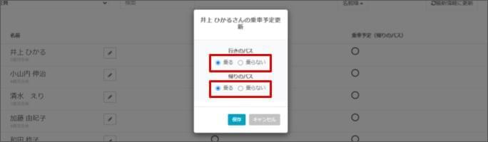 - 「行きのバス」または「帰りのバス」の乗車予定をそれぞれ選択し、[保存] をクリックします。