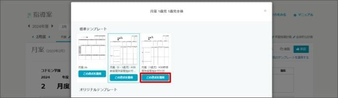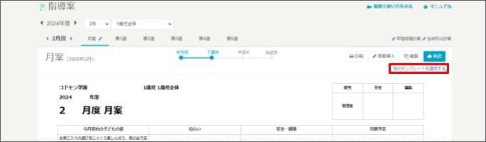 作成した指導案に他のテンプレートを適用する2026年1月9日 更新指導案を複製するには、指導案作成の権限が「編集可能」であることが必須です。 このページの操作を行うには、以下の設定が事前に必須です 【設定】オリジナル帳票テンプレートを設定する [記録と計画] > [指導案] をクリックします。 新しいテンプレートに適用したい月、クラスを選択します。 新しいテンプレートに適用したい指導案のタブを選択します。 [他のテンプレートを適用する] をクリックします。 新しいテンプレートの [この書式を適用] をクリックします。