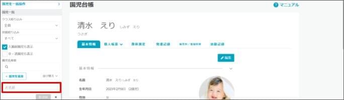 デモ園児(児童)を登録する2026年2月16日 更新このページの操作を行うには、以下の設定が事前に必須です デモ園児(児童)を利用する際の注意点 [園児(児童)台帳] をクリックします。 左側の [園児(児童)を追加」をクリックします。 園児(児童)の「お名前」を入力し、 [登録] をクリックします。 左側の一覧から登録した園児(児童)名 > [編集] をクリックします。 「デモ」にチェックを付けます。 入力が完了したら、 [保存] をクリックします。