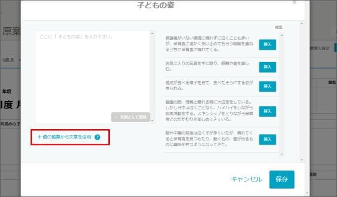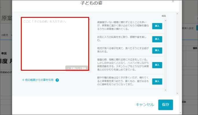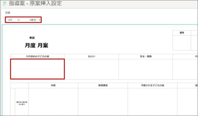 - 月案の場合、「同クラスの年間指導計画、行事予定」から引用できます。