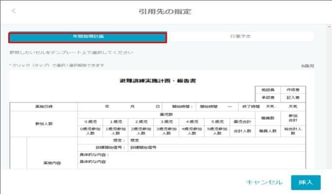 - 引用先の帳票(全体的な計画、年間指導計画、週案、月案)の引用したい項目を選択し、右下の [挿入] をクリックします。