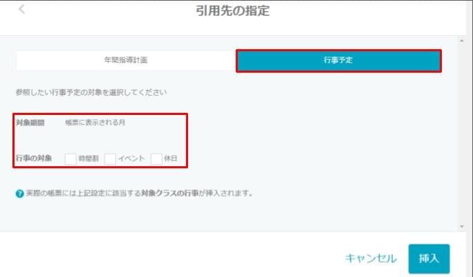 - 引用先の行事予定のタブをクリックし、「対象期間、行事の対象」を選択します。