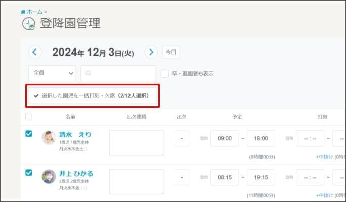 - [選択した園児(児童)を一括登録・欠席] をクリックします。