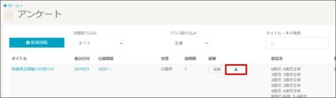 アンケートの結果をダウンロードする2026年1月13日 更新 [アンケート] をクリックします。 確認したいアンケートの [結果] のダウンロードマークをクリックします。 確認したいアンケートの [結果] > [結果ダウンロード] からもダウンロードできます。