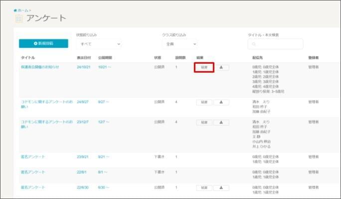 アンケート未回答者にお知らせを再通知する2026年1月13日 更新お知らせを再通知するためには、お知らせ一斉配信の権限が「編集可能」であることが必須です。 [アンケート] をクリックします。 再度お知らせしたいアンケートの [結果] をクリックします。 [未回答者へお知らせを作成] をクリックします。 匿名でのアンケートの場合、未回答者の特定ができないため再通知できません。 再通知したい内容を記入し、右下の [公開] をクリックします。