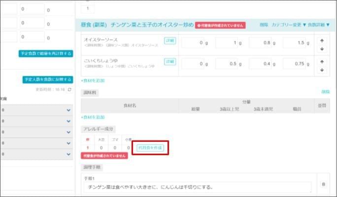 - 「代替食が作成されていません」とアラートが表示された料理名の [代替食を作成] をクリックします。