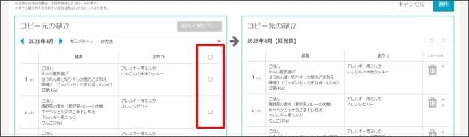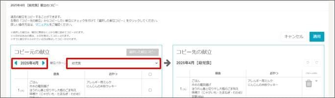 ※コピー先の日付に献立が未作成の場合、献立のコピーができます。 - 「コピー先の献立」の内容を確認し右上の [適用] をクリックします。