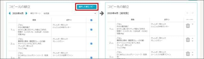 - 献立の複製は、幼児食内または乳児食内で行えます。