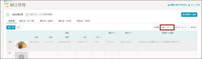 - 職員管理画面に戻り、 [献立情報をインポート(ファイルの選択)] をクリックします。