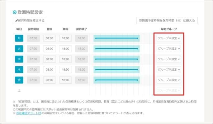 - 「登園時間設定」> 「帰宅グループ」のプルダウンをクリックし、帰宅グループを選択します。