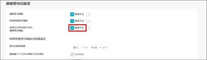【設定】お迎え以外の帰り方の連絡受付設定をする2025年12月9日 更新設定画面の操作は、設定機能の権限が「承認可能」であることが必須です。 このページの操作を行うには、以下の設定が事前に必須です 【設定】園児(児童)の帰宅グループを作成する [設定] をクリックします。 左側の [家庭からの連絡] をクリックします。 [お迎え以外の帰り方の連絡受付機能] > [使用する] にチェックを付けます。 画面下の [設定を保存] をクリックします。