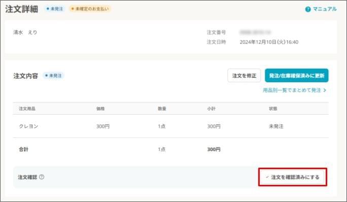 - 完了にすると、「注文管理」 > 「注文確認」の列にチェックマークが付きます。