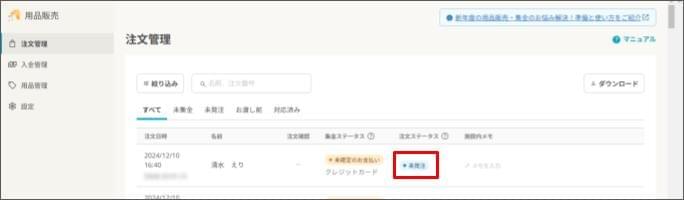- 「注文管理」 >「注文ステータス」の列が「未発注」の注文内容をクリックします。