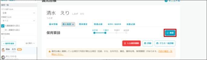 保育要録を作成する2026年2月25日 更新 [園児台帳] をクリックします。 保育要録を記録したい園児(児童)をクリックします。 [個人帳票] > [保育要録] をクリックします。 入力したい項目の [入力欄] をクリックします。項目ごとに文例を登録できます。 内容を入力します。 [保存] をクリックします。 全ての入力が完了したら [承認] をクリックします。