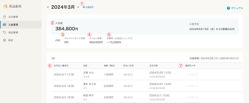 ※当月1日~末日までにクレジットカード払いのお支払いを確定した注文と保護者にてコンビニ払いが完了している注文のみが当月分として確認できます。- ① 当月の入金状況を確認します。