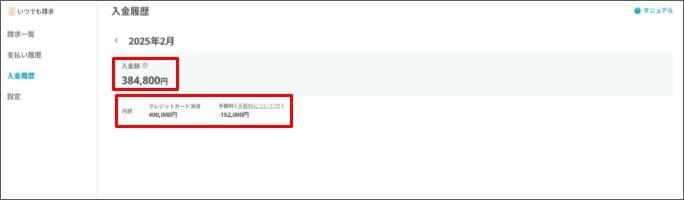 入金情報を確認する(いつでも請求)2026年2月26日 更新入金情報を確認するには、いつでも請求の権限が「編集可能」であることが必須です。 [請求管理] > [いつでも請求] をクリックします。 左側の [入金履歴]をクリックします。 入金履歴を確認します。※前月1日~末日の間に集金済となった請求が対象です。 入金額:当月の入金額 クレジットカード決済:クレジットカード決済の合計金額 手数料:当月のキャッシュレス集金にかかった手数料の合計金額