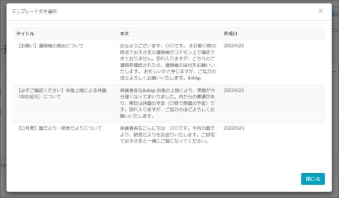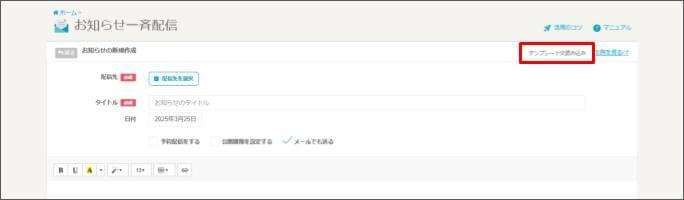 お知らせの本文にテンプレート文を引用する2026年2月9日 更新テンプレートを引用するためには、お知らせ一斉配信の権限が「編集可能」であることが必須です。 このページの操作を行うには、以下の設定が事前に必須です 【設定】お知らせ一斉配信のテンプレート文を登録する [お知らせ一斉配信] をクリックします。 [新規投稿] をクリックします。 [テンプレート文読み込み] をクリックします。 使用したいテンプレート文を選択します。本文に引用したテンプレートが挿入されます。