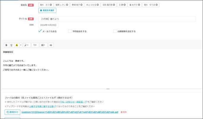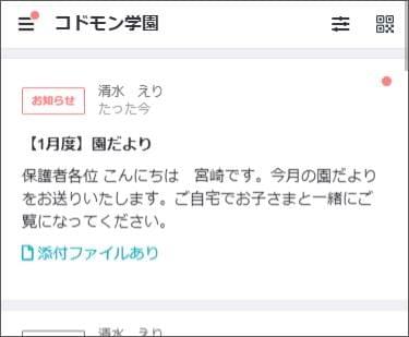 保護者アプリの見え方:お知らせ一斉配信2026年1月20日 更新目次施設管理画面保護者アプリ画面施設管理画面 保護者アプリ画面 ①ホーム画面への通知 ②お知らせ詳細の画面 保護者アプリの手順は、園(施設)から配信されたお知らせを確認・ブックマークするをご確認ください。