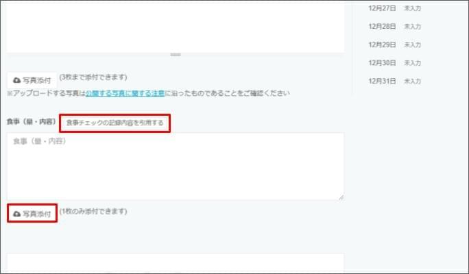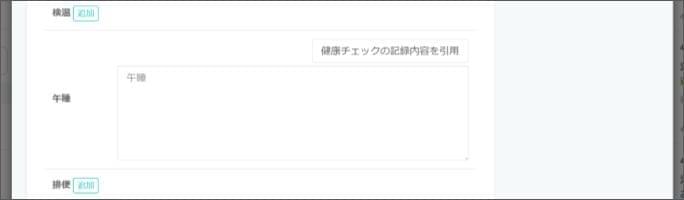 - 「食事チェック」で喫食量や写真を記録している場合は自動で反映されます。反映されていなければ、 [食事チェックの記録内容を引用する] をクリックします。