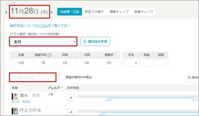 - 特定のクラスや園児(児童)を絞り込みたい場合は、プルダウンからクラスを選択したり、確認したい園児(児童)名を入力します。