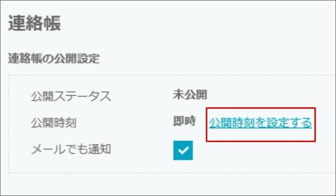 - 公開時間を予約したい場合は、 [公開時刻を設定する] をクリックし、予約時間を選択のうえ > [設定] をクリックします。