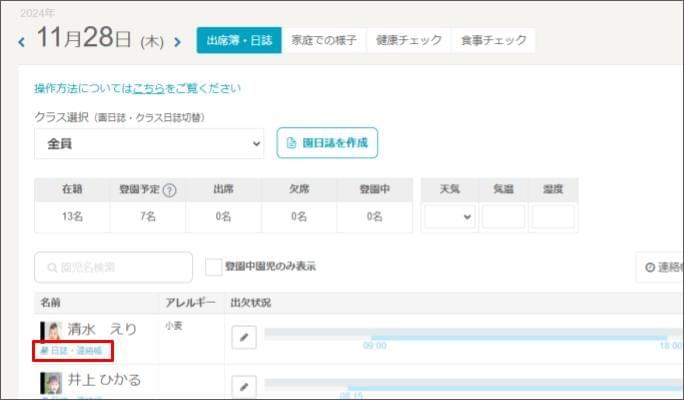 - 園児(児童)名の下にある [日誌・連絡帳] をクリックします。