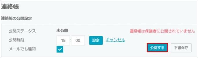 連絡帳公開時刻は、一括で予約することもできます。 - 保護者に連絡帳の公開をメールで通知しない場合は、「メールでも通知」のチェックを外してください。