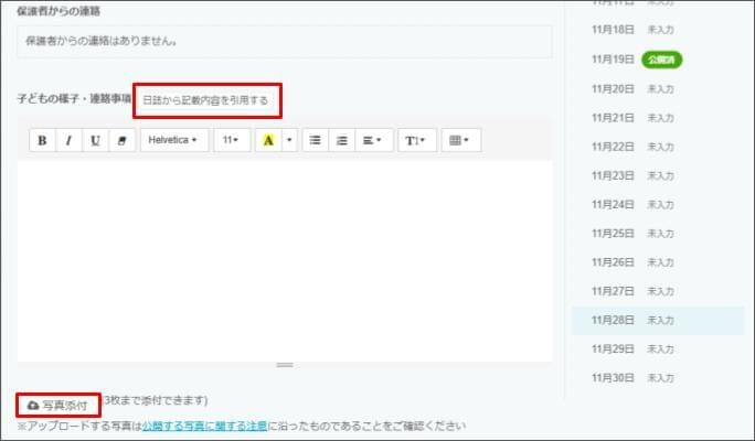 - 連絡帳を作成する前に「健康チェック」で記録済みの内容は、自動で反映されます。反映されていない場合は、 [健康チェックの記録内容を引用] をクリックします。