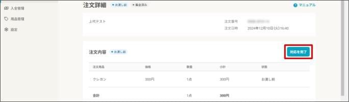 - 対応完了にすると、「注文管理」 > 「注文ステータス」の列が「対応済み」に変わります。