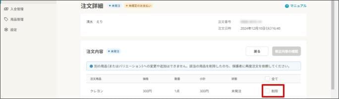 左上の [絞り込み] > [クラス・グループ] をクリックまたは、園児(児童)名を入力して絞り込みもできます。 - [注文を修正] をクリックします。