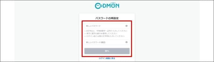 ※メールが届かない場合は、アドレスの誤りか未登録、複数アカウントに同一アドレスが設定されているなどの可能性があります。特権ユーザーや統括アカウントを持つ管理者へ登録状況をご確認ください。 - [新しいパスワード] と [新しいパスワード(確認)] を入力し、[次へ] をクリックします。